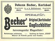 1805 besuchte der Reichsgraf Plettenberg-Mietingen mit seinem Begleiter, dem englischen Doktor Frobrig, Karlsbad. Die beiden quartierten sich in das "Haus der drei Lerchen" ein, welches der Apotheker Jan Becher besaß. Die Leidenschaft, Kräuter und Alkohol zu mischen, verband den englischen Arzt und den tschechischen Apotheker.