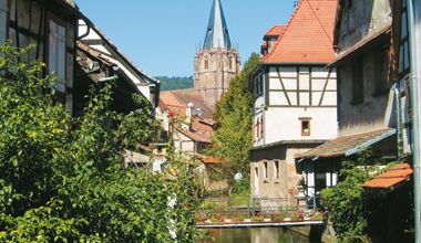 Kaysersberg mit Kostbarkeiten aus dem Mittelalter und der Renaissance. Alte freie Reichsstadt. Burgruinen (13. Jh.) und Türme der alten Stadtmauer. Geburtshaus von Albert Schweitzer.
